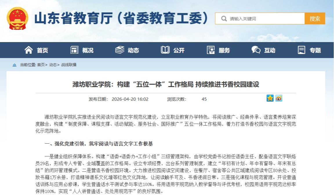 近日,由潍坊职业学院举办的内蒙古乡土文化能人专题班在奎文校区顺利举行。内蒙古农牧厅乡村振兴促进中心主任梁勇峰、副主任王生富、乡村建设和社会事业处副处长李彦超、继续教育学院负责同志出席开班仪式。来自内蒙古的61名乡土文化能人参加培训。本次培训班课程内容丰富多样,紧密围绕乡村文化建设与产业发展需求设计。在理论授课学习中,老师深入解读了北疆文化的内涵、历史脉络与价值,引导学员深刻认识本土文化特色,增强文化自信与传承使命感。...