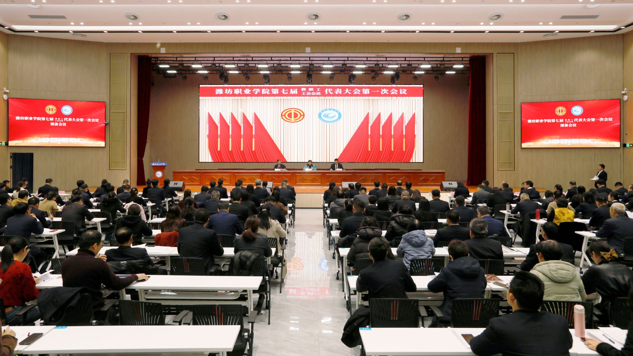 12月10日下午,潍坊职业学院第七届教职工代表大会第一次会议、第七届工会会员代表大会第一次会议预备会议在滨海校区综合楼一楼报告厅召开。学院党委委员高凌云,党委委员、组织人事处处长于涛,工会主要负责人王忠及全体正式代表参会,会议由高凌云主持。