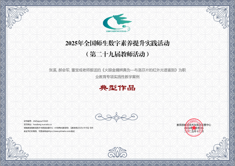近日,教育部教育技术与资源发展中心公布了2025年全国师生数字素养提升实践活动评选结果。由我院张溪等教师撰写的《火眼金睛辨真伪——布洛芬片的红外光谱鉴别》实践性教学案例,在职业教育专项评选中脱颖而出,获评实践性教学案例典型作品。
