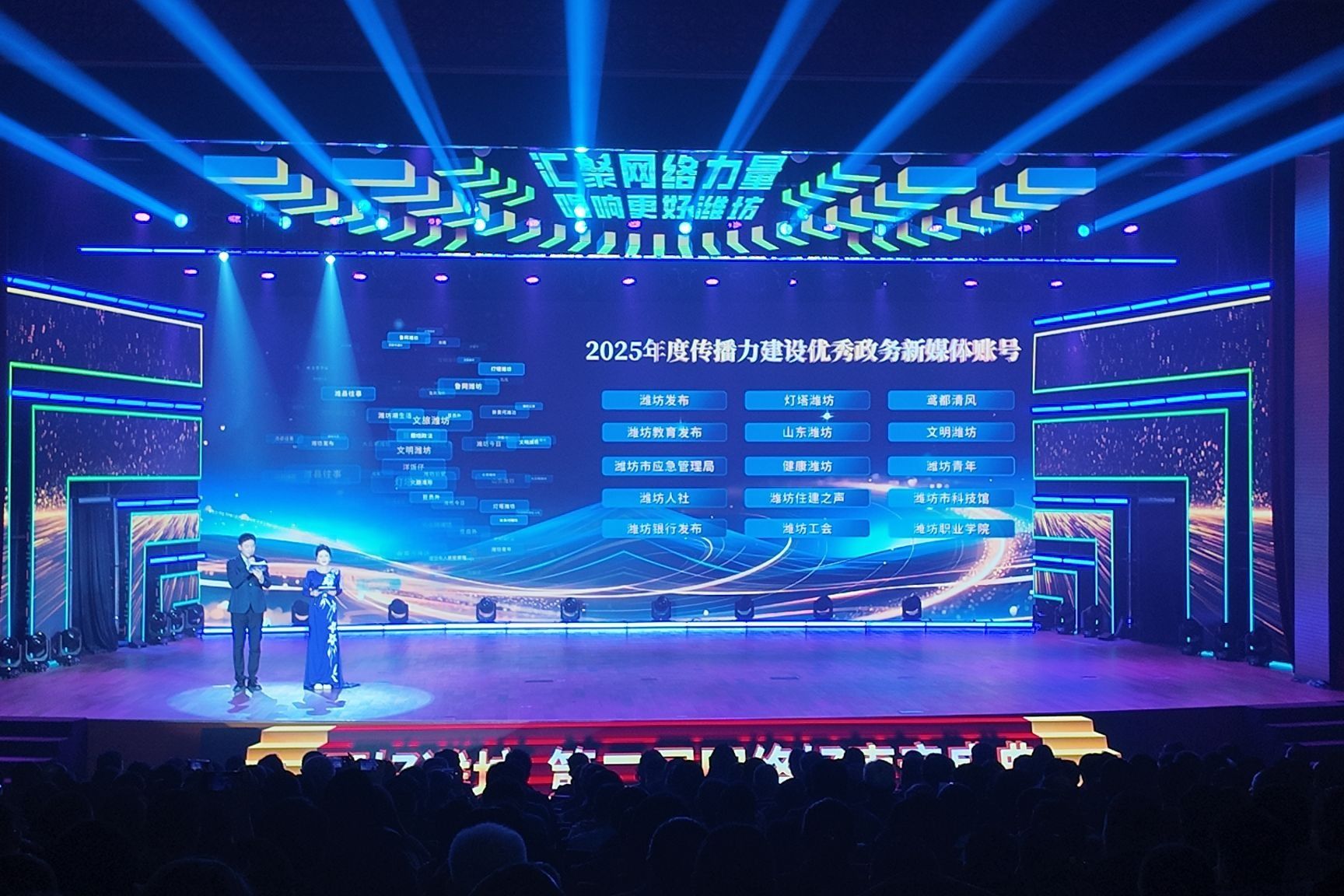 1月22日,由中共潍坊市委宣传部主办的“更好潍坊・第二届网络好声音盛典”在富华国际会议中心召开。会上,我院获评“潍坊市2025年度传播力建设优秀政务新媒体账号”。此项荣誉的获得,不仅是对学院宣传工作成果的高度认可,更彰显了学院在服务地方发展、助力“更好潍坊”宣传工作中的积极贡献。