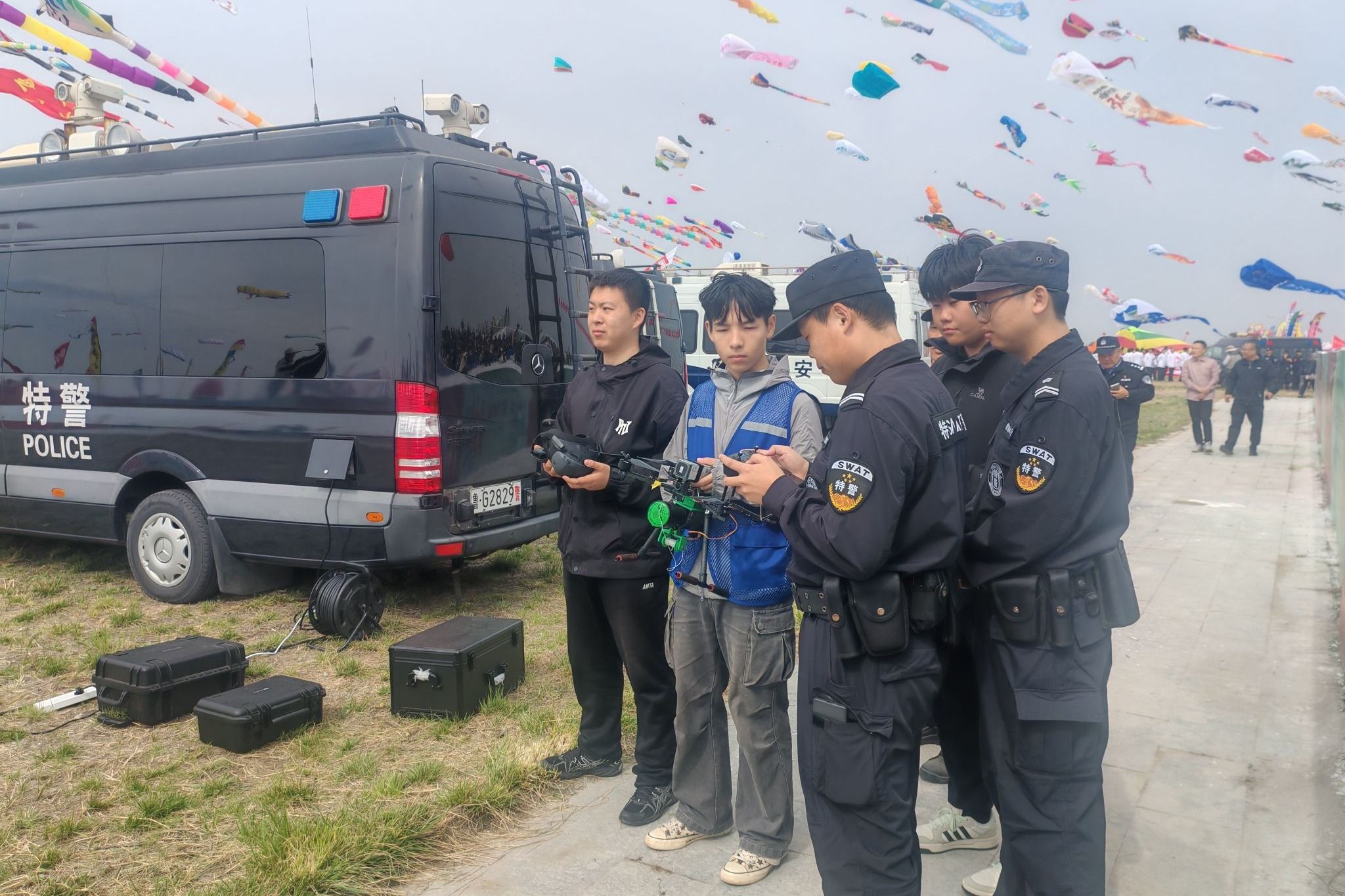 根据安保工作方案,我院师生分别编入核心现场无人机组和反制及报备核查组,与特警大队及联盟单位协同作战。我院联合山东信校、渤海湾港应急、潍坊边检等单位,对主会场、放飞区、观众区开展低空巡查、实时监控、隐患排查与空中劝导,同时在关键点位部署侦测反制装备,核查报备信息,及时处置违规飞行并上报,确保低空空域安全有序。